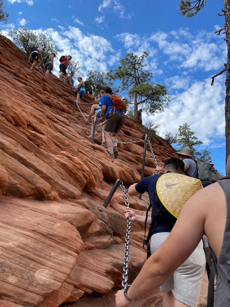 Sure enough, the line waiting to get to the trailhead easily took over 50 minutes and when we got there many people were already making their way up the 5.5-mile round trip hike. The highlight of this trail is a .5 mile upwards incline at the end where people climb up an extremely narrow and steep canyon cliff overlooking the entire park.